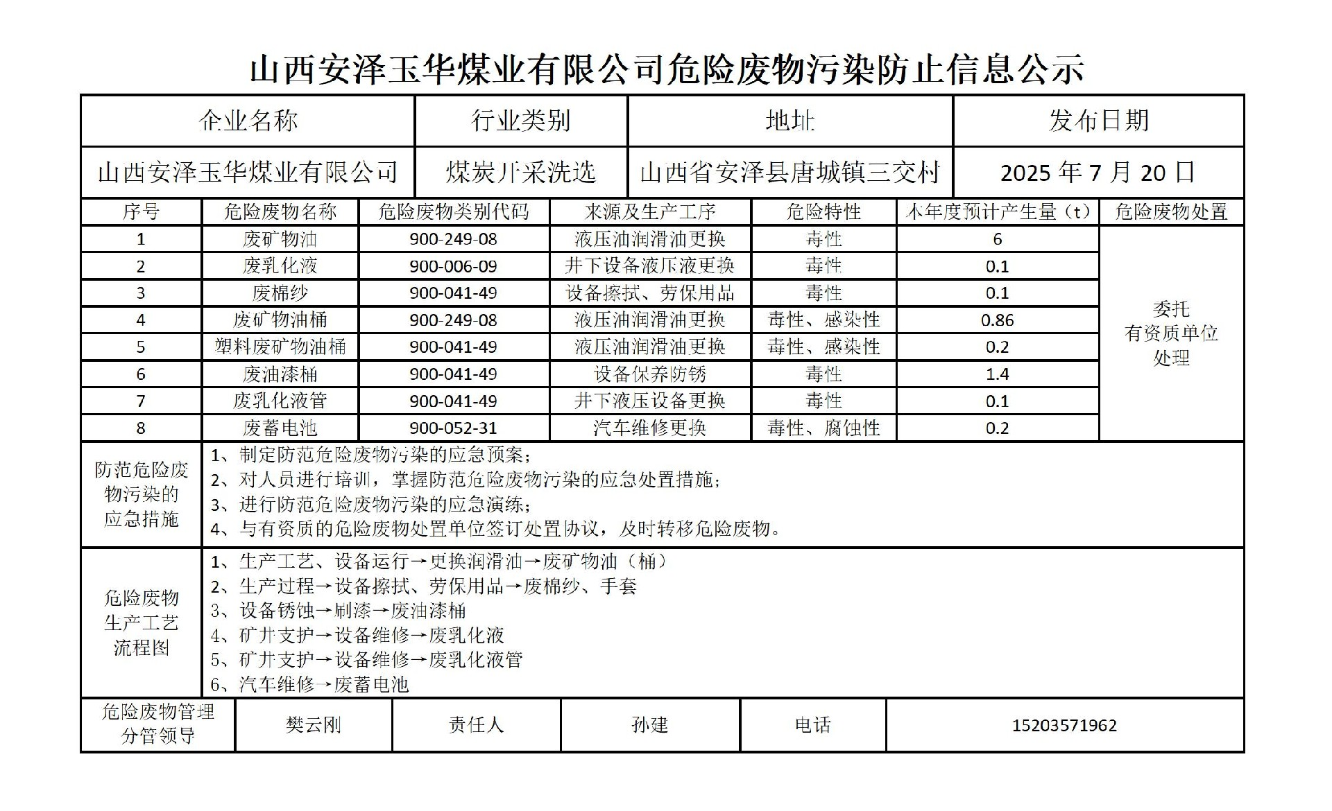 山西安泽玉华煤业有限公司危险废物污染防止信息公示